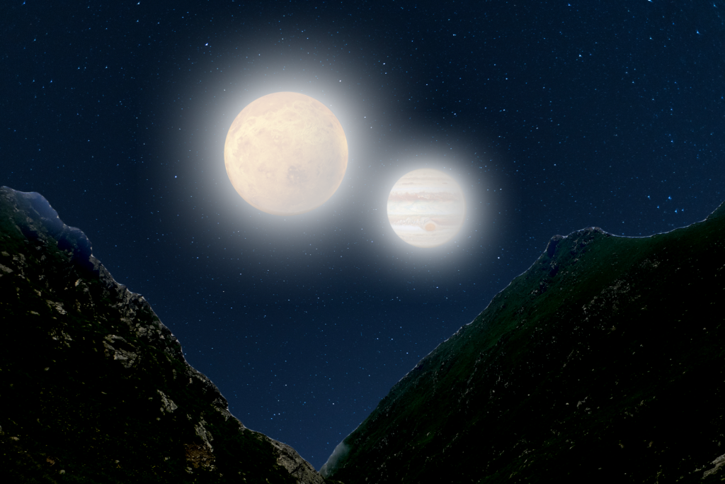 Are you wondering what those two super bright stars are in the sky tonight? They’re actually Venus and Jupiter! The Venus Jupiter Conjunction, as it’s formally known, can also be called the Venus and Jupiter Cosmic Kiss. This is happening because both plants are orbiting the sun and passing each other. Throughout the week we’ll be feeling their inspiring vibes and reminding us that even big things can look small from a different perspective.